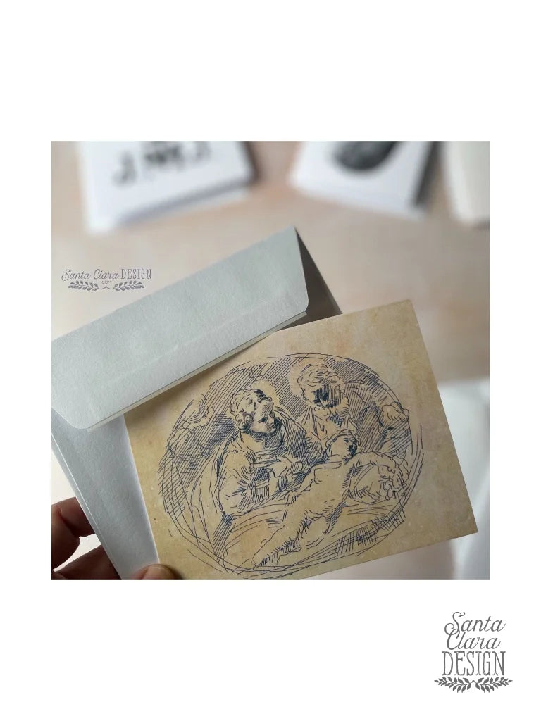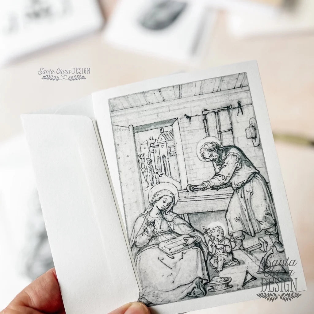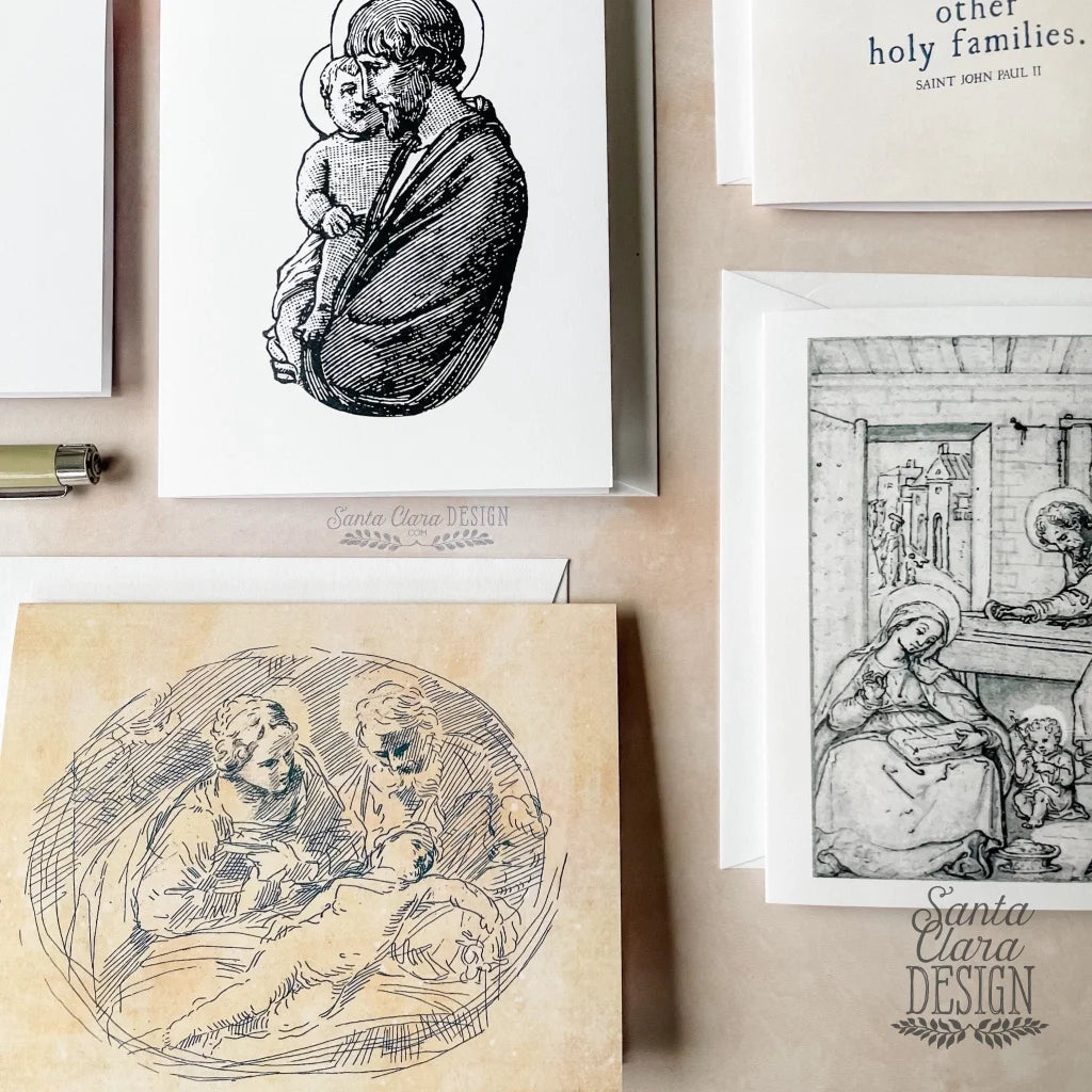 A set assorted notecards featuring art dedicated to the Holy Family. Included in the set are notecards featuring: St. Joseph holding the child Jesus, the Holy Family Workshop, JMJ, St. John Paul II Holy Family quote, Vintage Holy Family sketch and a vintage Holy Family woodcut. This one of a kind notecard set is perfect to keep on hand for a number of occasions - a birthday, housewarming, baptism, Advent, new baby, marriage, anniversary, Mother's Day, Father's Day, many more!