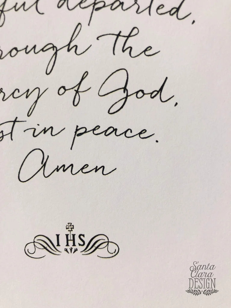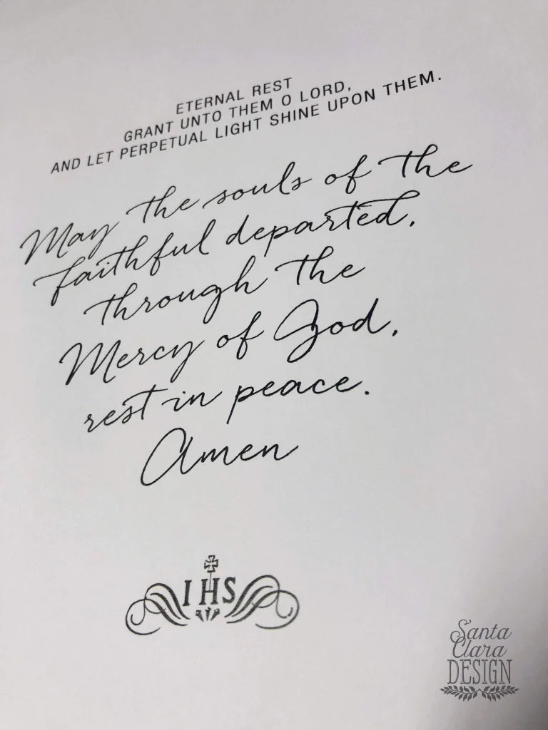 An elegant and inspirational custom designed Catholic prayer for those who have passed away. This traditional prayer is often prayed aloud at funerals and memorial services, and gives great comfort. This makes a thoughful gift for someone who is grieving, or a piece to display at a funeral, funeral reception, or on your prayer table to help you remember to pray for those who have gone before us.