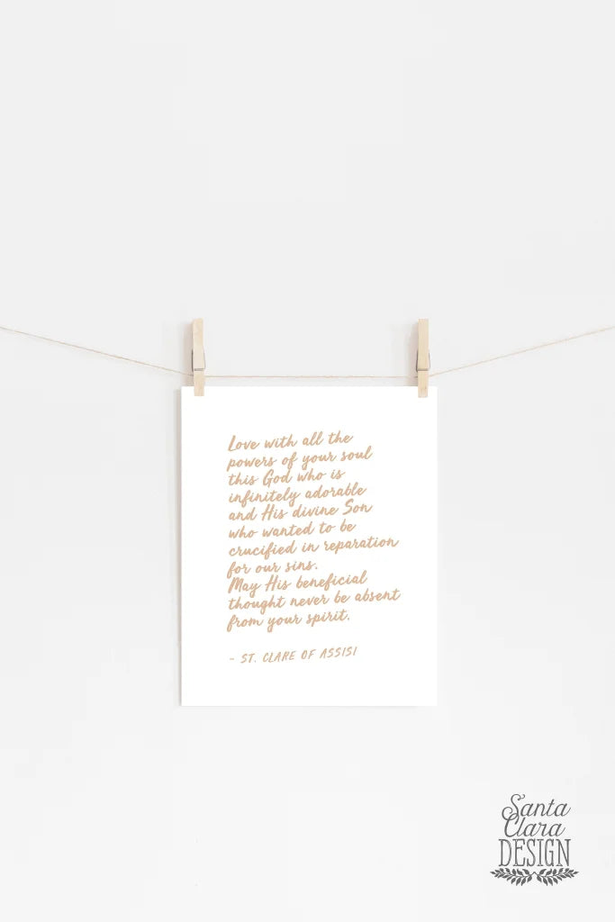 An elegant and custom designed art print of St. Clare of Assisi's quote "Love with all the powers of your soul this God who is infinitely adorable ..."