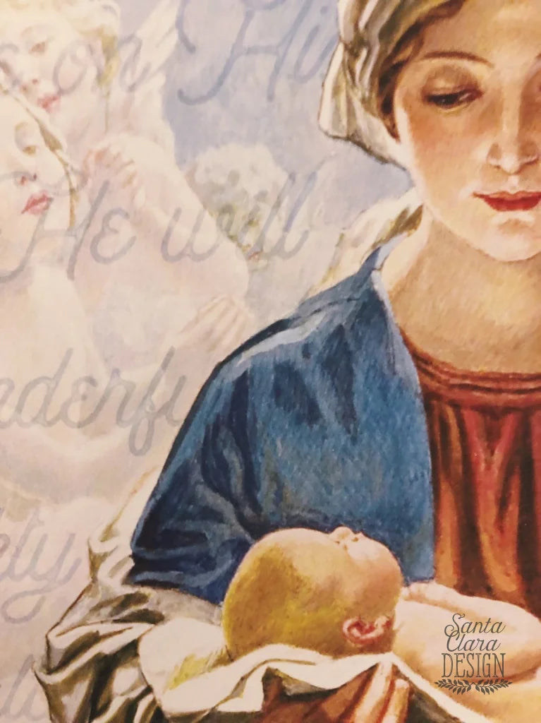 An elegant, reverent and festive custom designed print featuring our Blessed Mother Mary and the Baby Jesus, with the Star of Bethlehem shining above them. Around them, the angels are singing their glory, and, if you look closely, you'll see the prophetic words of Isaiah of the old testament, foretelling the greatness of our baby savior: "For to us a child is born, to us a son is given, and the government will be on his shoulders. And he will be called Wonderful Counselor, Mighty God, Everlasting Father, Prince of Peace." Isaiah 9:6