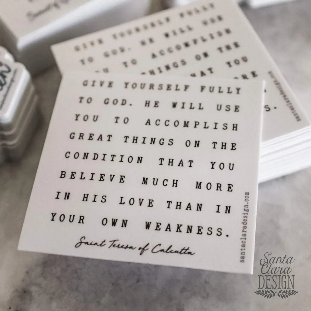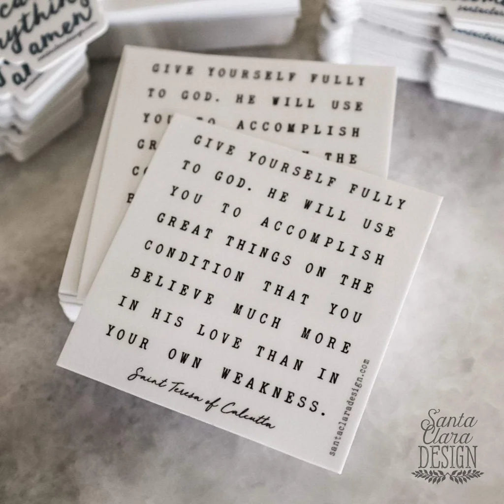 You'll want to order one of these 3x3" vinyl decals for your journal, water bottle, car, laptop, stroller or bike. This simple design features a powerful quote from St. Teresa of Calcutta, "Give yourself fully to God. He will use you to accomplish great things..." This quote reminds us that we can trust in God to work through us - He is always good and has our best intention in mind!
