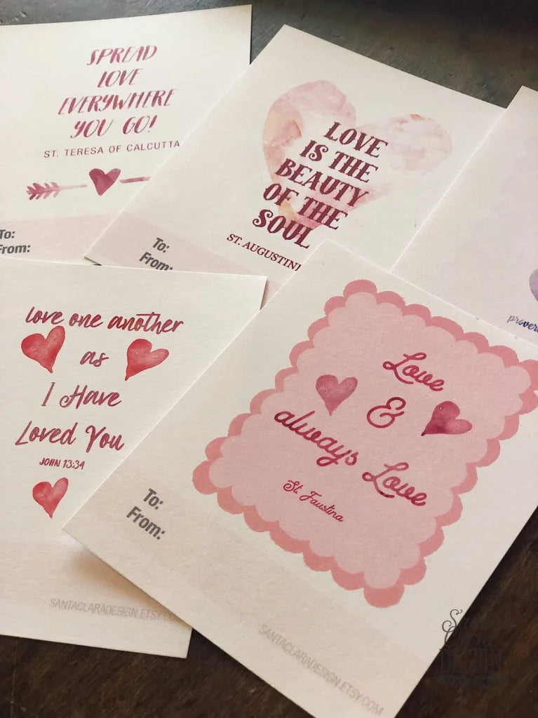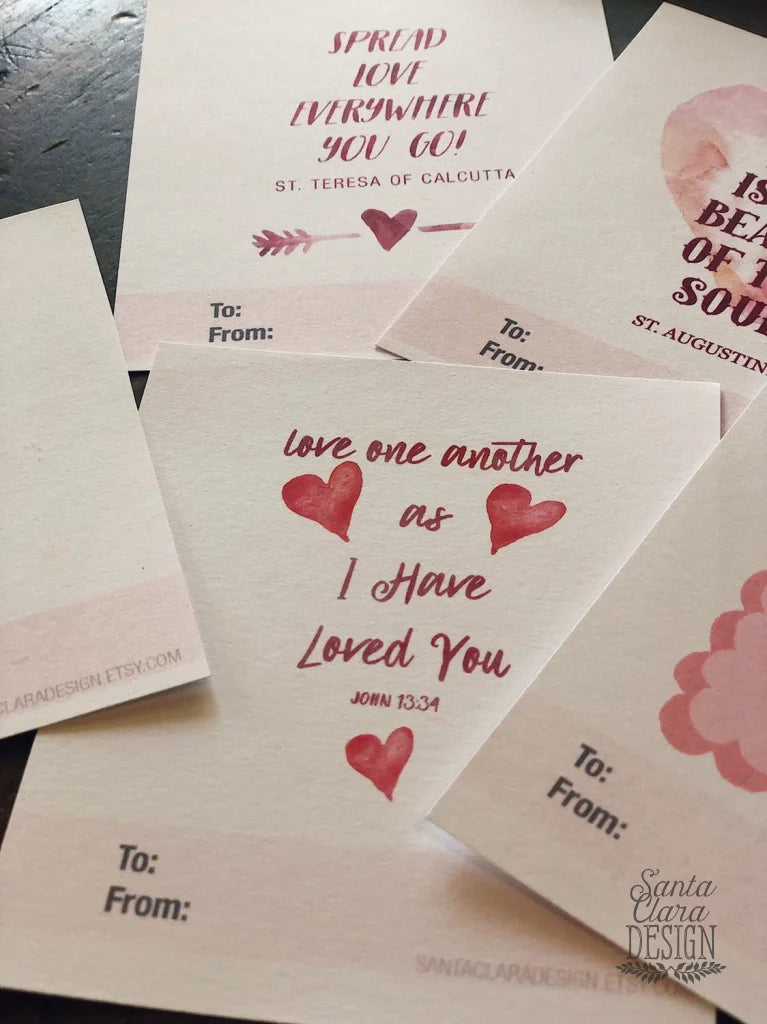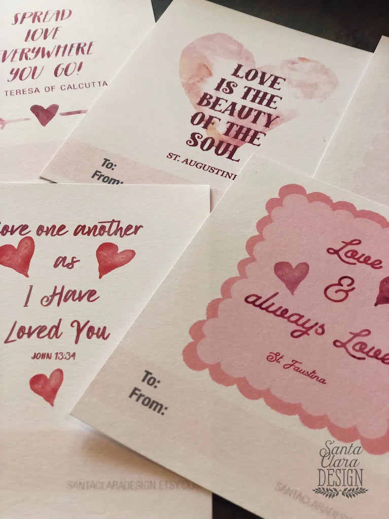 PRINTABLE Six elegant and inspirational custom designed Catholic Valentine cards to celebrate this day of love - perfect for a gift for any loved one! Give to friends, classmates, neighbors, friends at work or school, Bible Study partners or RE students! Also a good gift idea for any time, Weddings, Engagements, Christmas, Easter, Birthdays, or for a cute way to decorate your home, dorm or office.