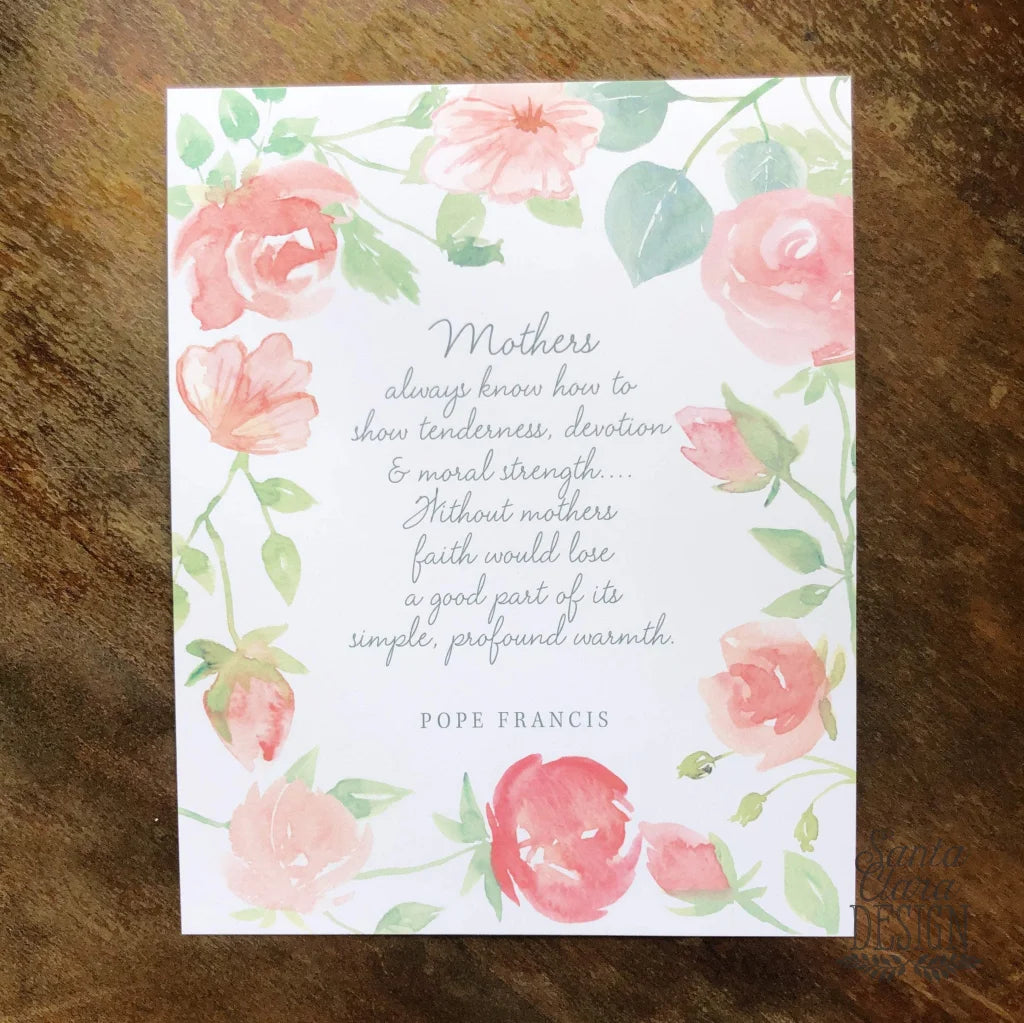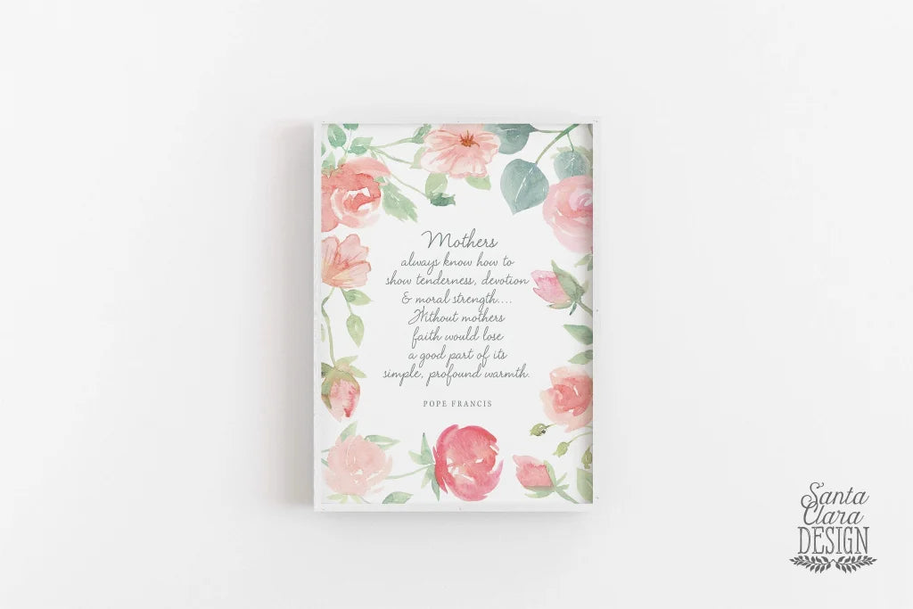 An elegant and inspirational custom designed quote from Pope Francis about the importance of the love and prayer of a mother. Perfect for gifts - especially for Mother's Day or your wife or mom's birthday Also a good gift idea for your mom and or wife's feast day, Thanksgiving , Christmas, Easter, Valentine's Day, or just because. Will look great in your home or office wall.