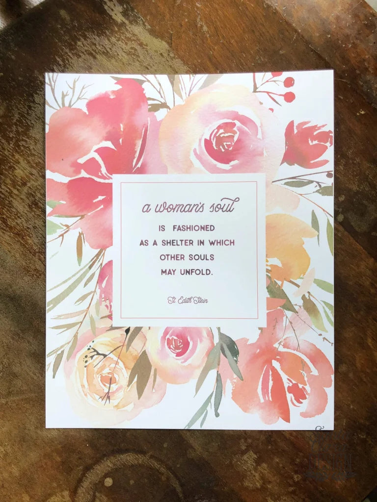 An elegant and inspirational custom designed quote from St. Edith Stein, aka St. Theresa Benedicta of the Cross. She writes about the unique role of a woman's soul. Perfect for gifts - especially for Mother's Day or your wife, friend, sister or mom's birthday Also a good gift idea for a feast day, Thanksgiving , Christmas, Easter, Valentine's Day, or just because. Will look great in your home or office wall.