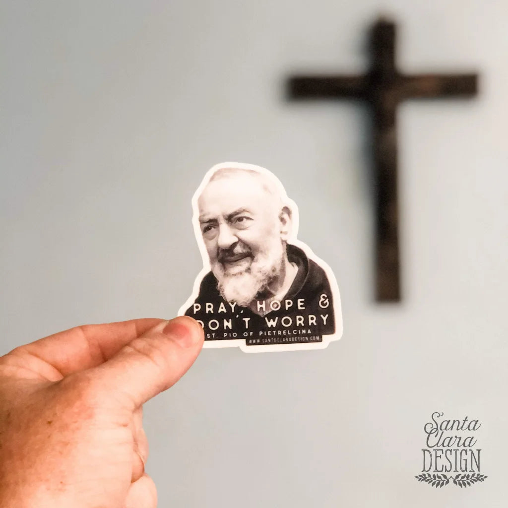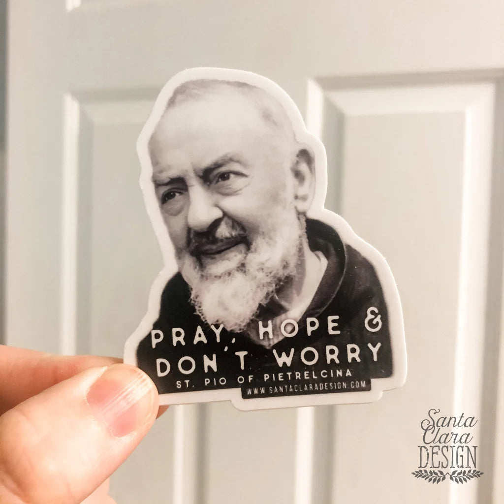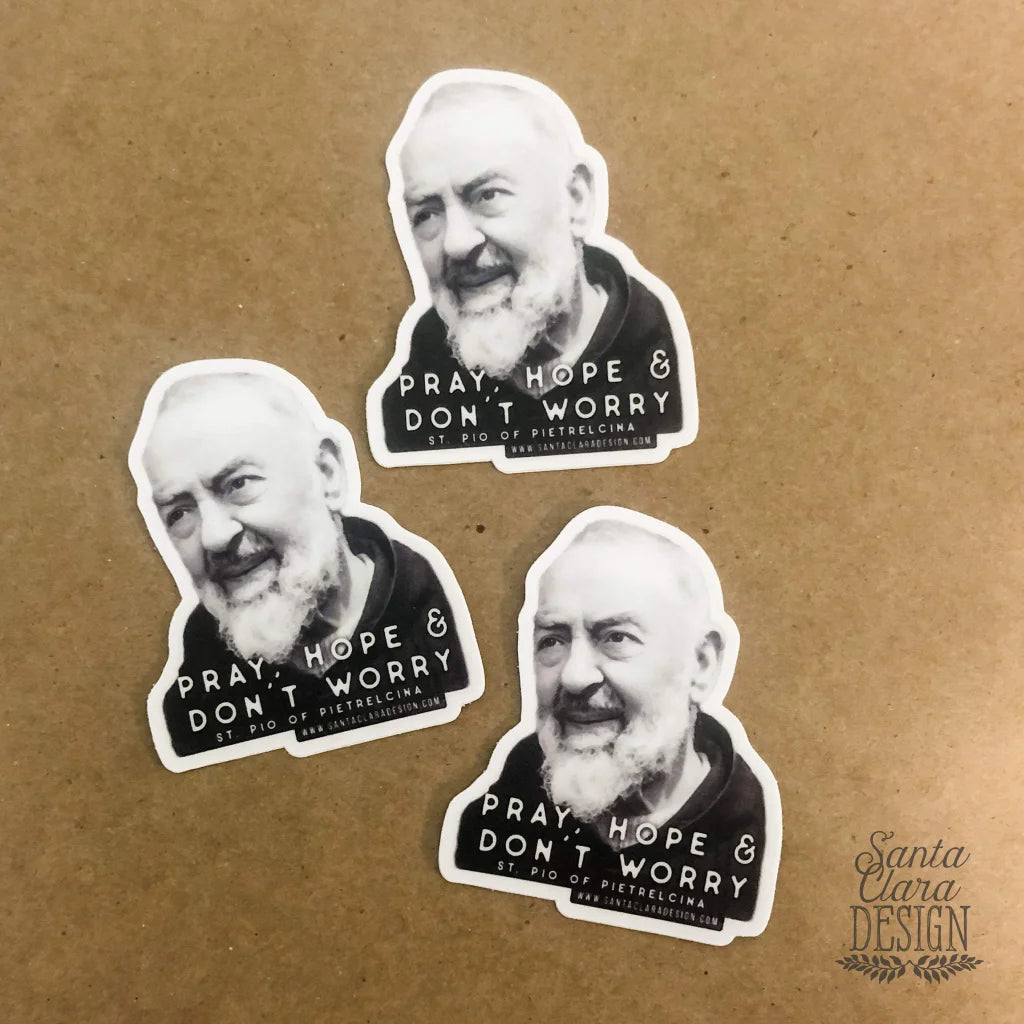 FREE SHIPPING! You'll want to order one (or more!) of these 2.4" x 3" inch decals for your car, tumbler, water bottle, laptop, bike. The decal features words from St. Padre Pio's famous reminder for life: Pray, Hope and Don't Worry!